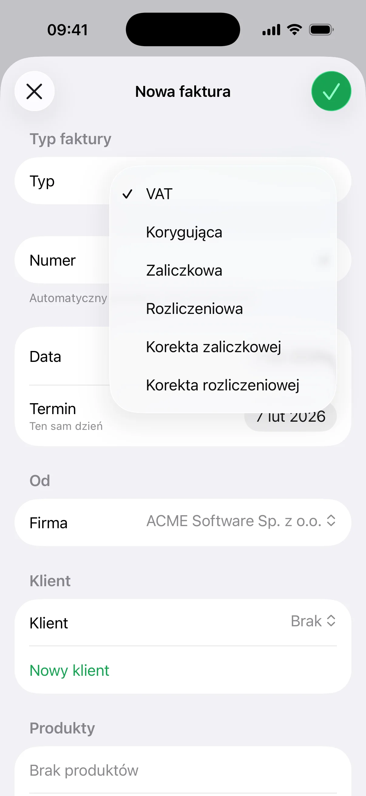 Wysyłaj faktury VAT i faktury korygujące przez KSeF w ustrukturyzowanym formacie XML. Obsługa faktur zaliczkowych i rozliczeniowych pojawi się wkrótce.